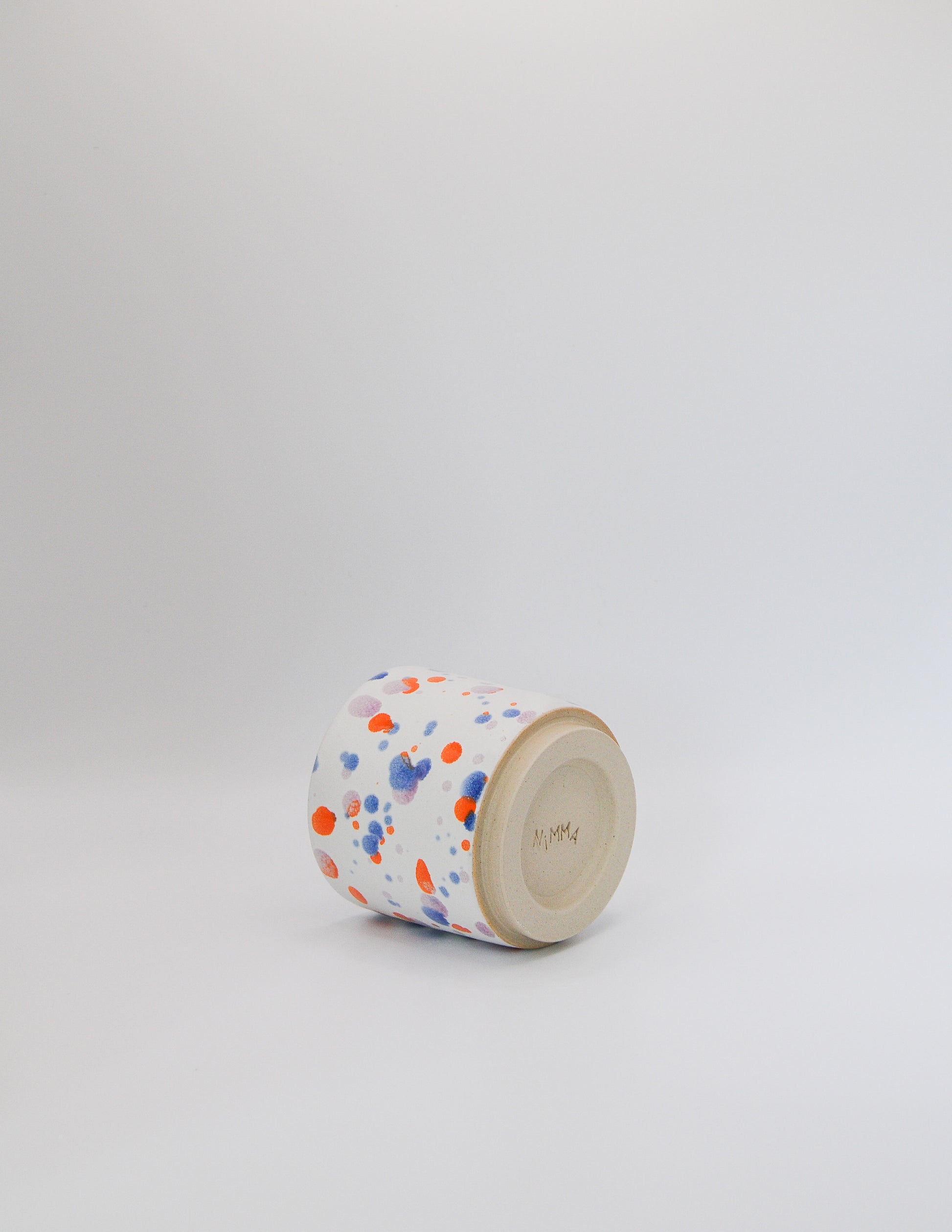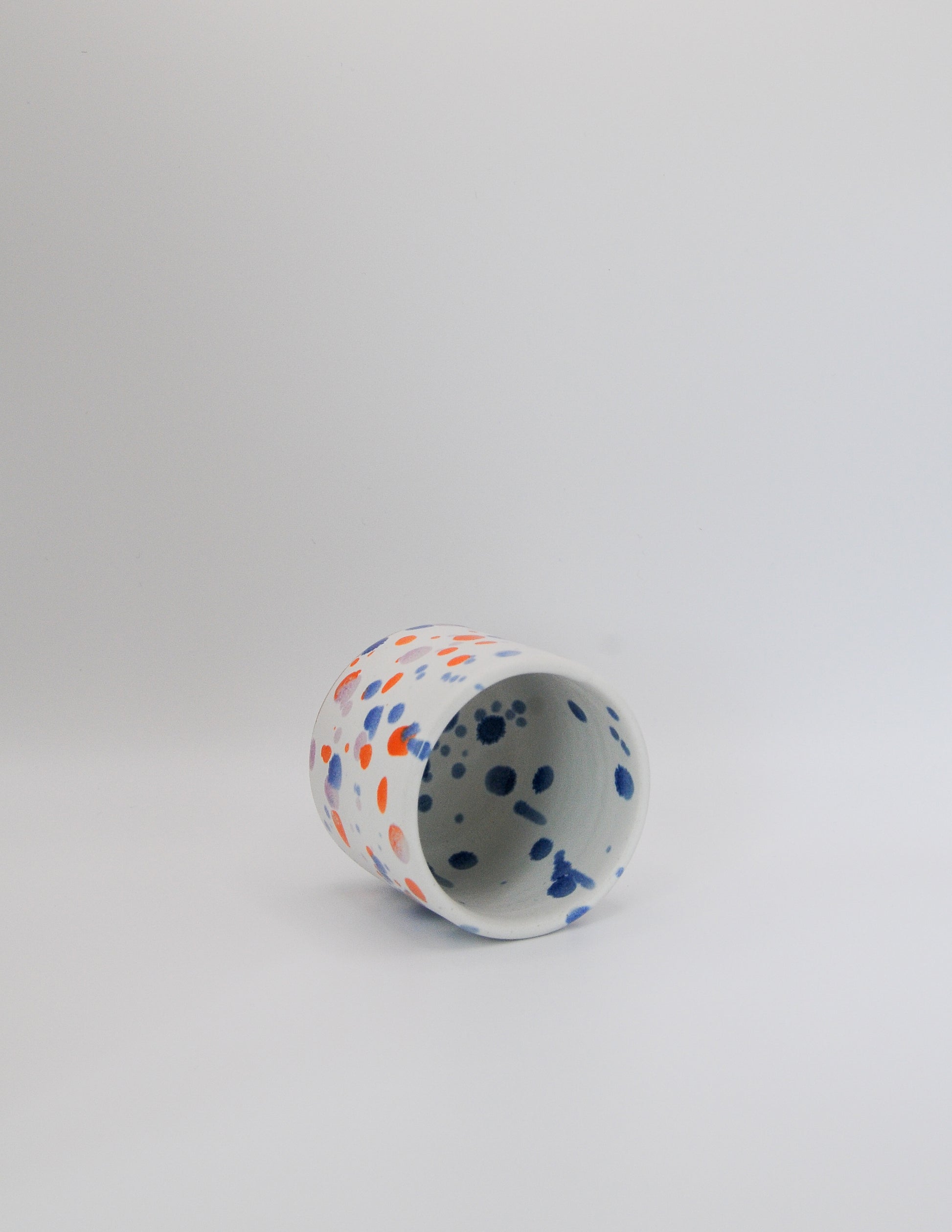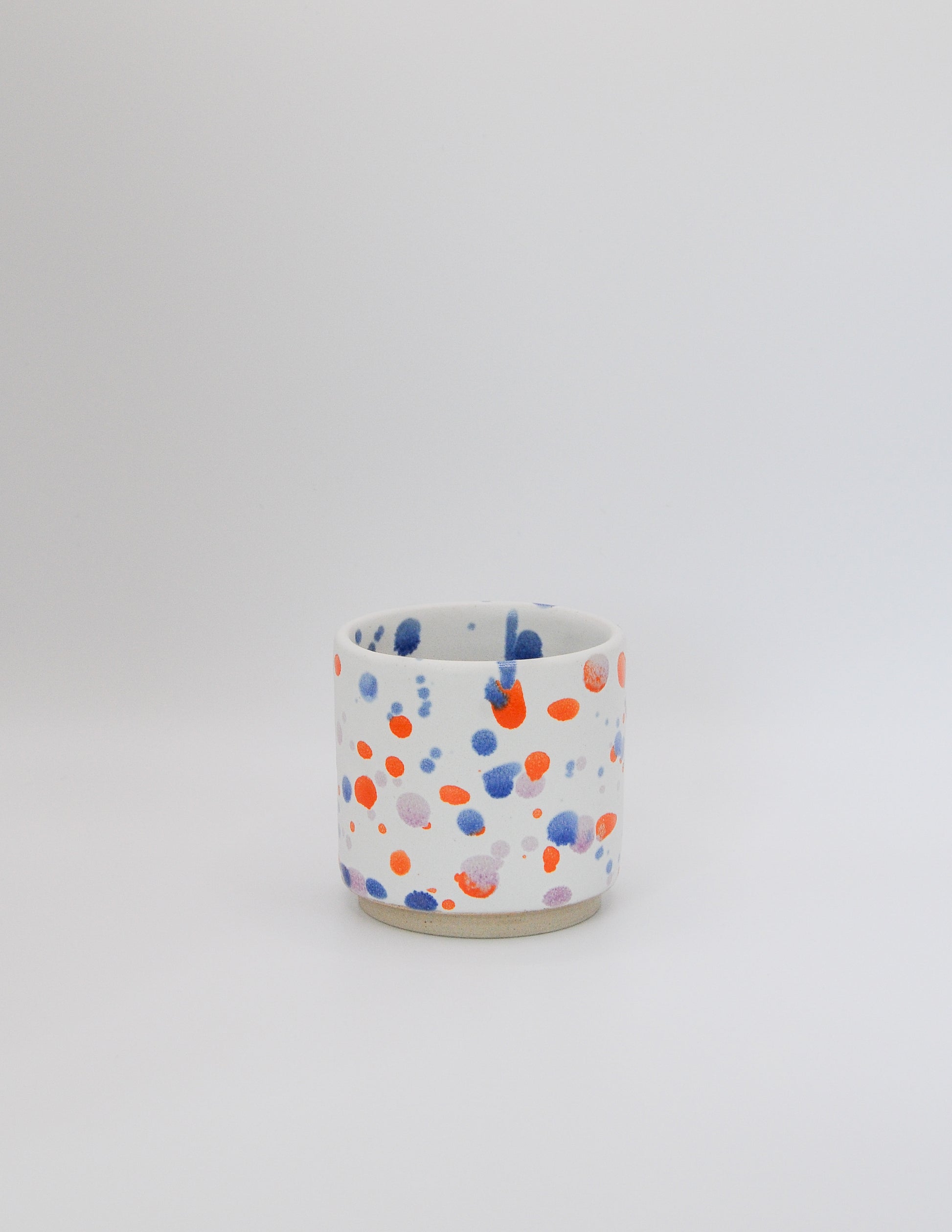 Stapelbarer Espresso Becher aus hellgrauem Steinzeugton. Bunt gesprenkeltes Exterieur und blau gesprenkeltes Interieur auf mattweißer Glasur.