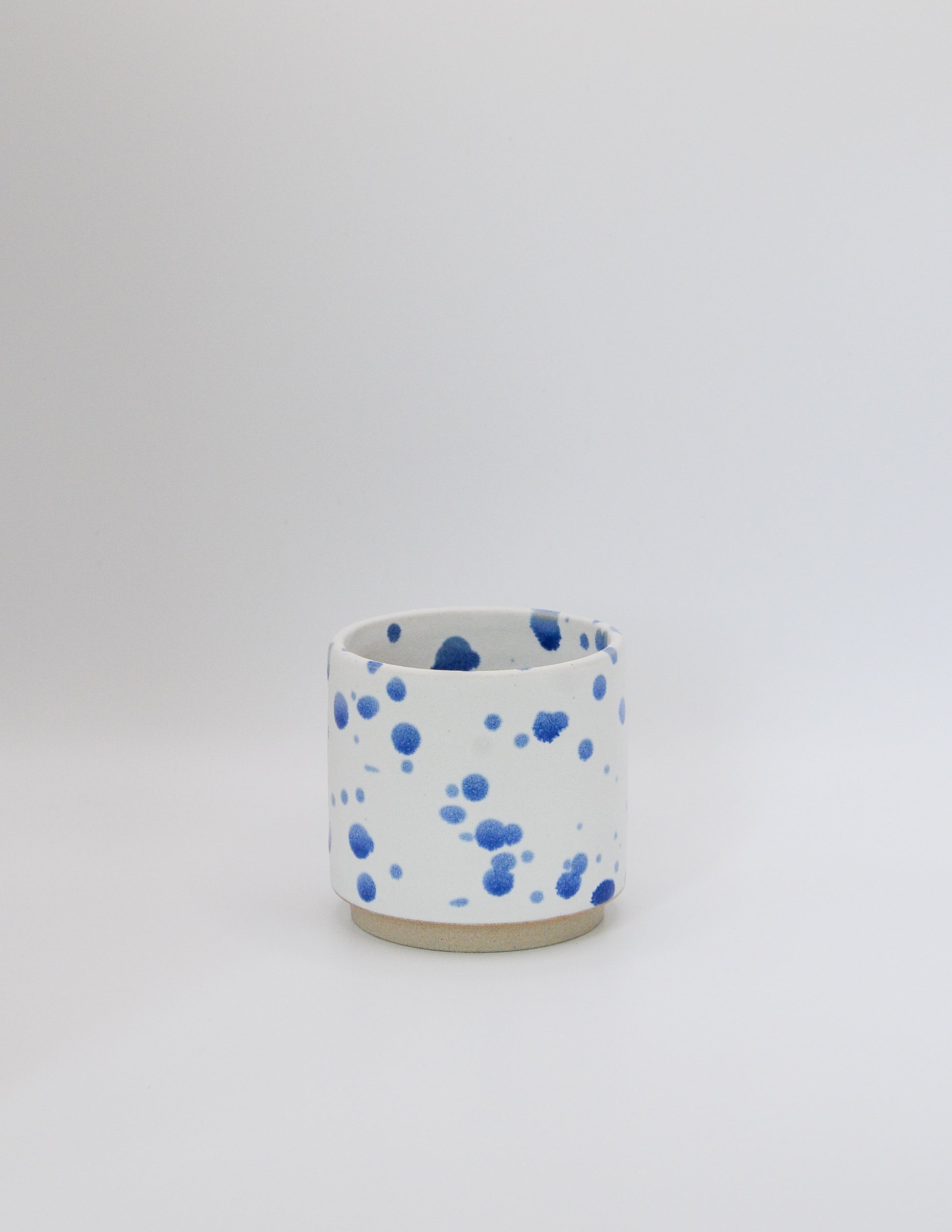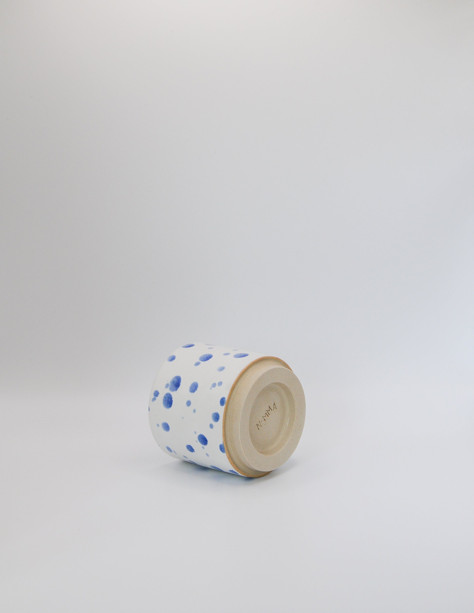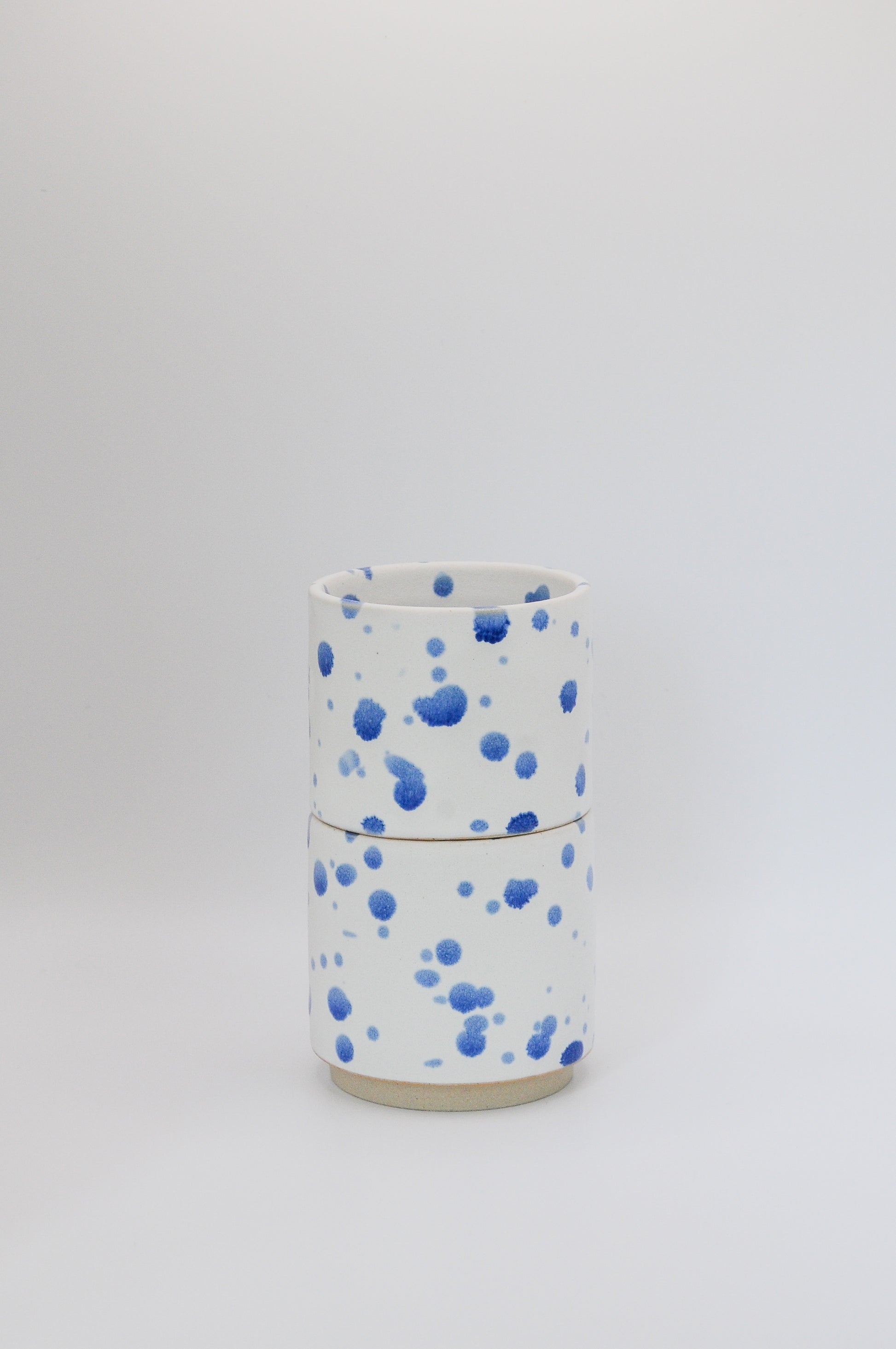 Stapelbarer Espresso Becher aus hellgrauem Steinzeugton. Blaue Sprenkel auf mattweißer Glasur.