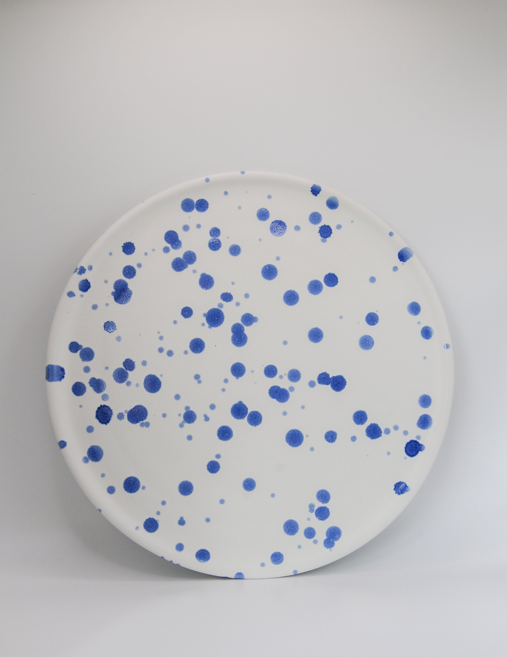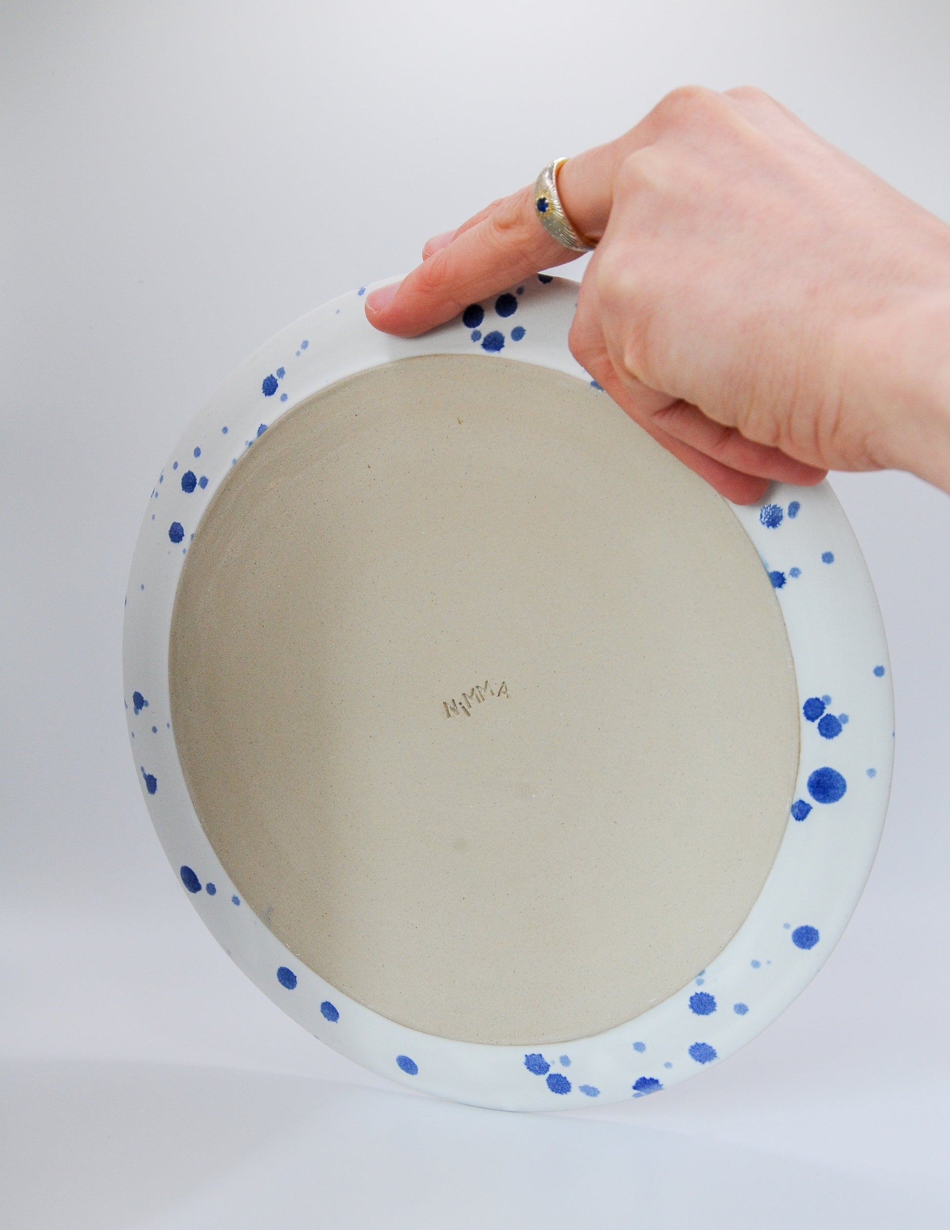 Frühstücksteller aus hellgrauem Steinzeugton. Blaue Sprenkel auf mattweißer Glasur.