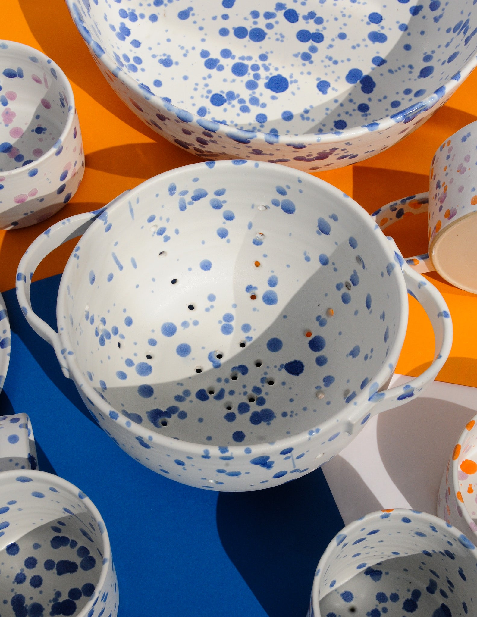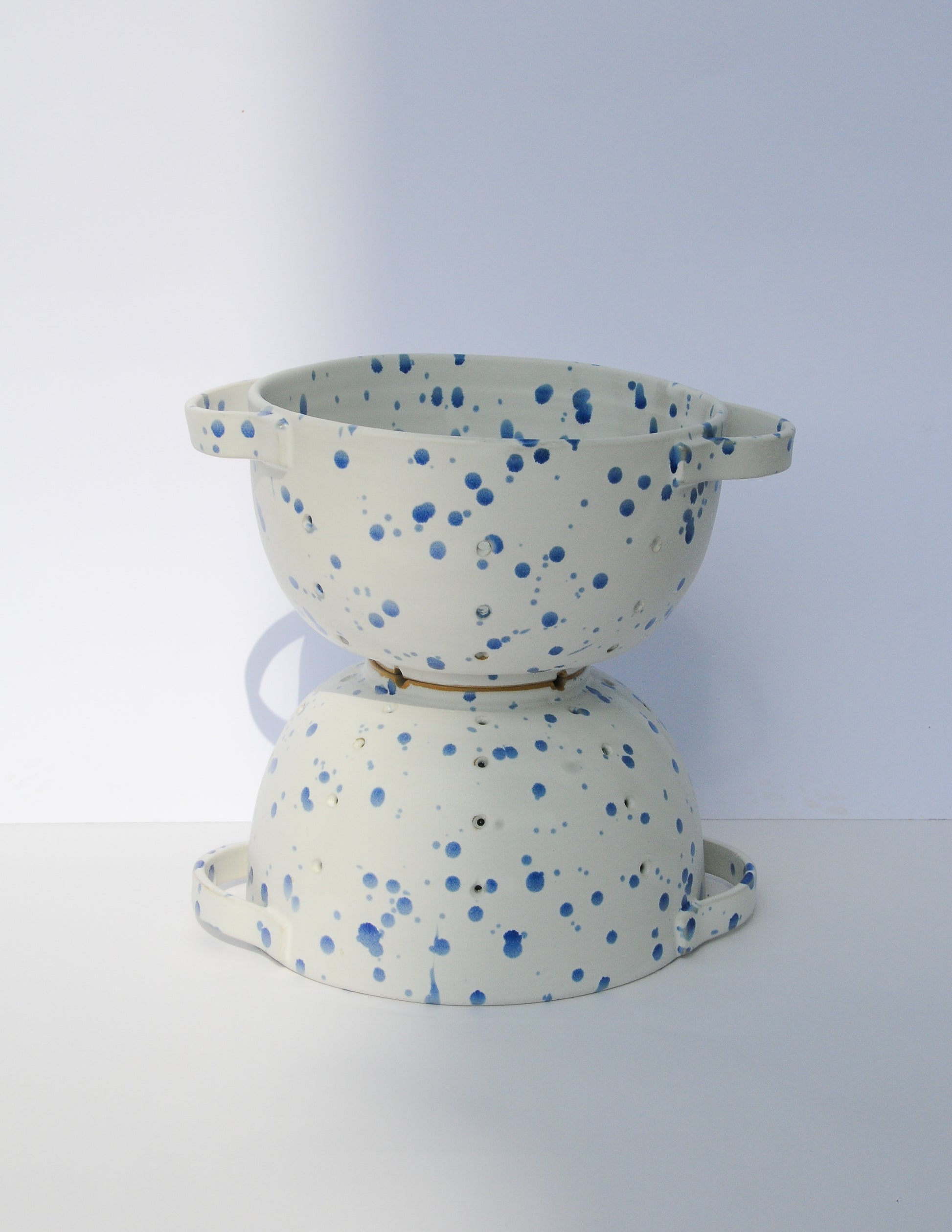 Sieb mit Henkeln aus hellgrauem Steinzeugton. Blaue Sprenkel auf mattweißer Glasur.