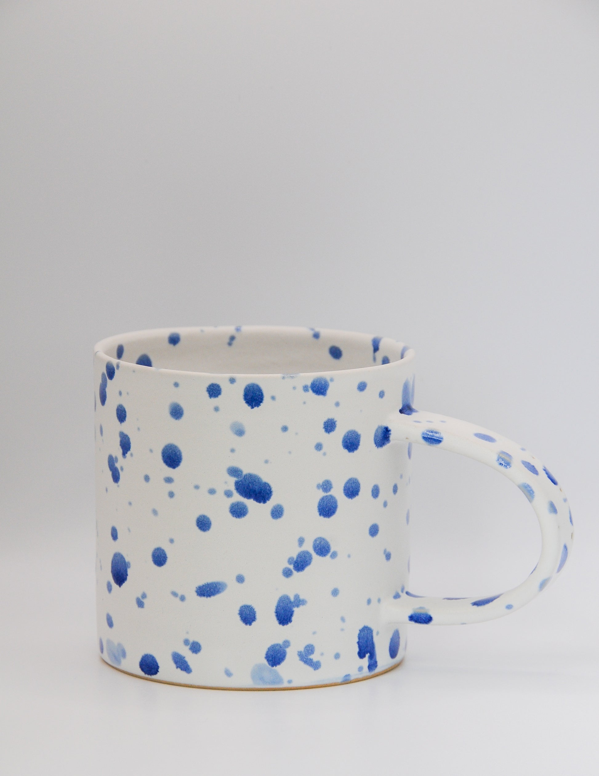 Hohe Tasse mit Henkel aus hellgrauem Steinzeugton. Blau gesprenkelt auf mattweißer Glasur.