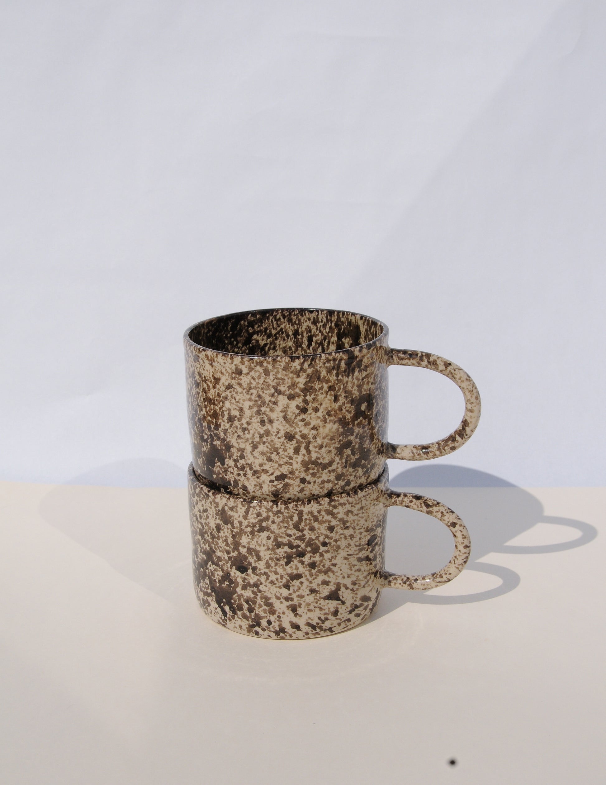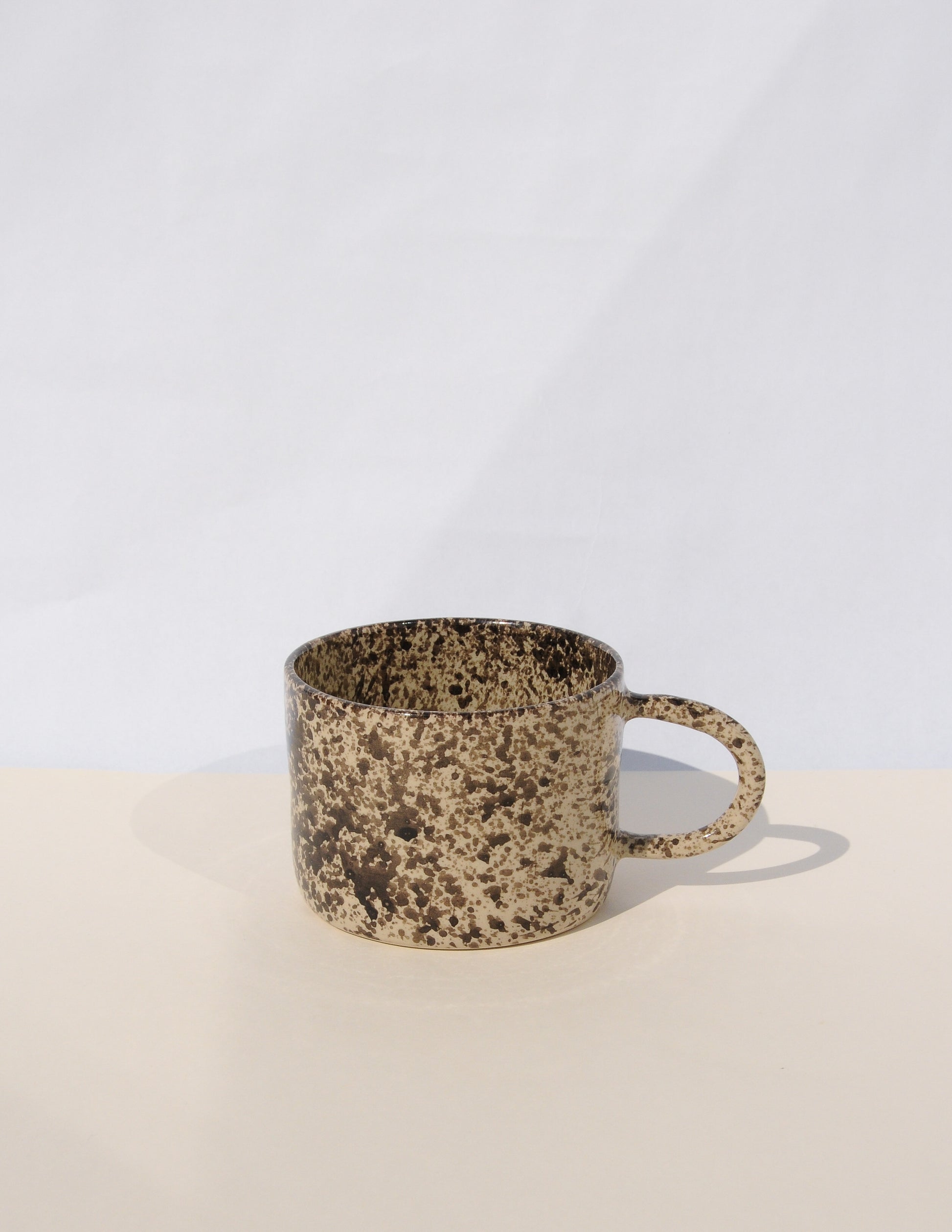 Tasse mit filigranem, runden Henkel, gedreht aus hellem Steinzeugton. Glänzende transparente Glasur mit dunkelbraunen Spritzern.
