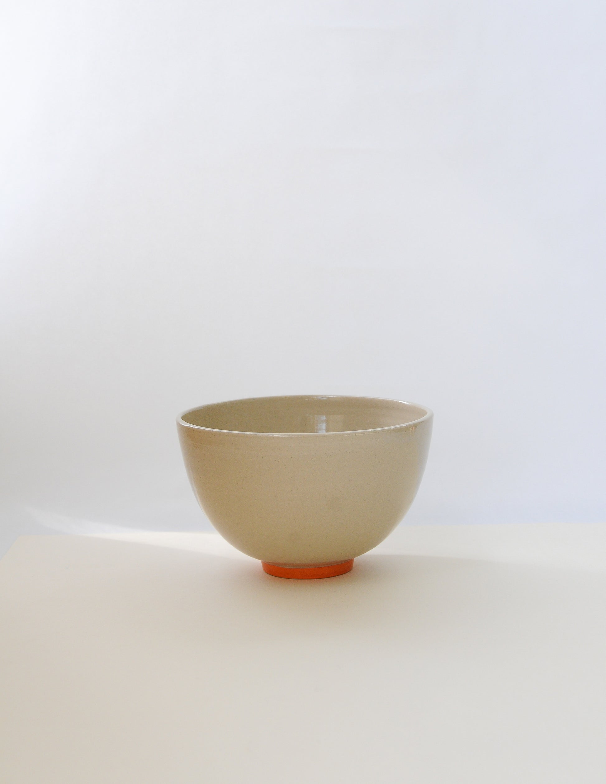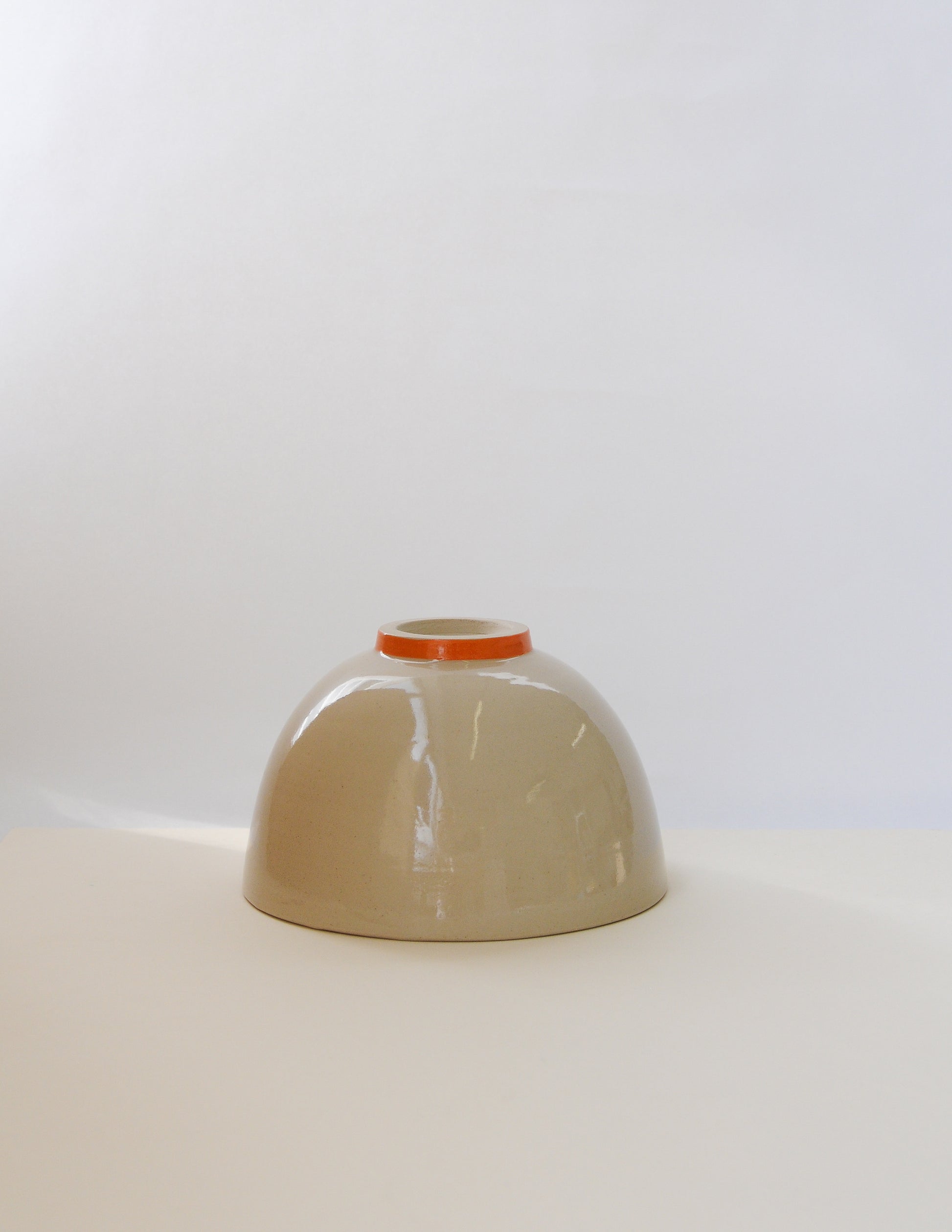 Schale gedreht aus hellem Steinzeugton mit handbemaltem Fußring in strahlendem orange, überzogen von transparent glänzender Glasur.