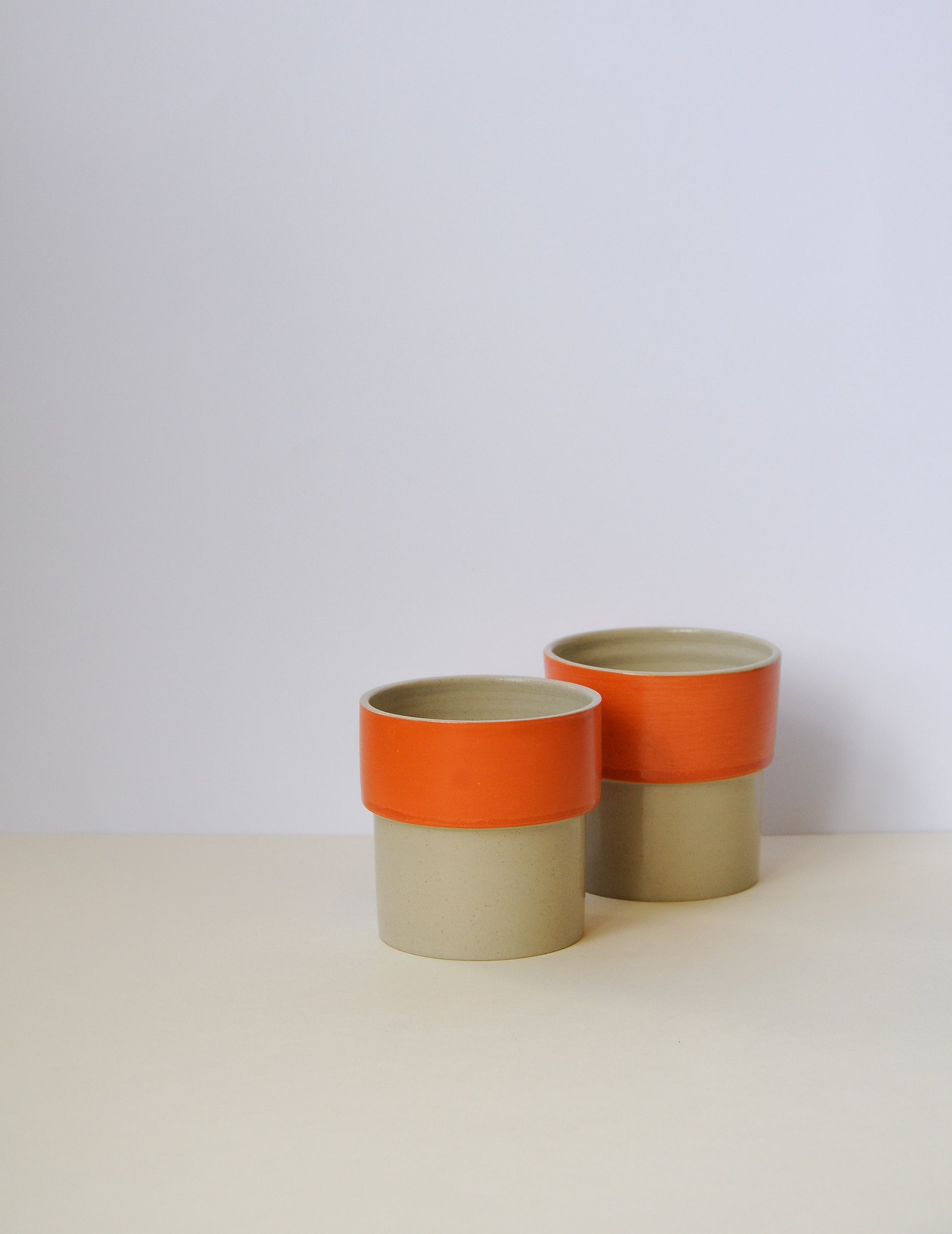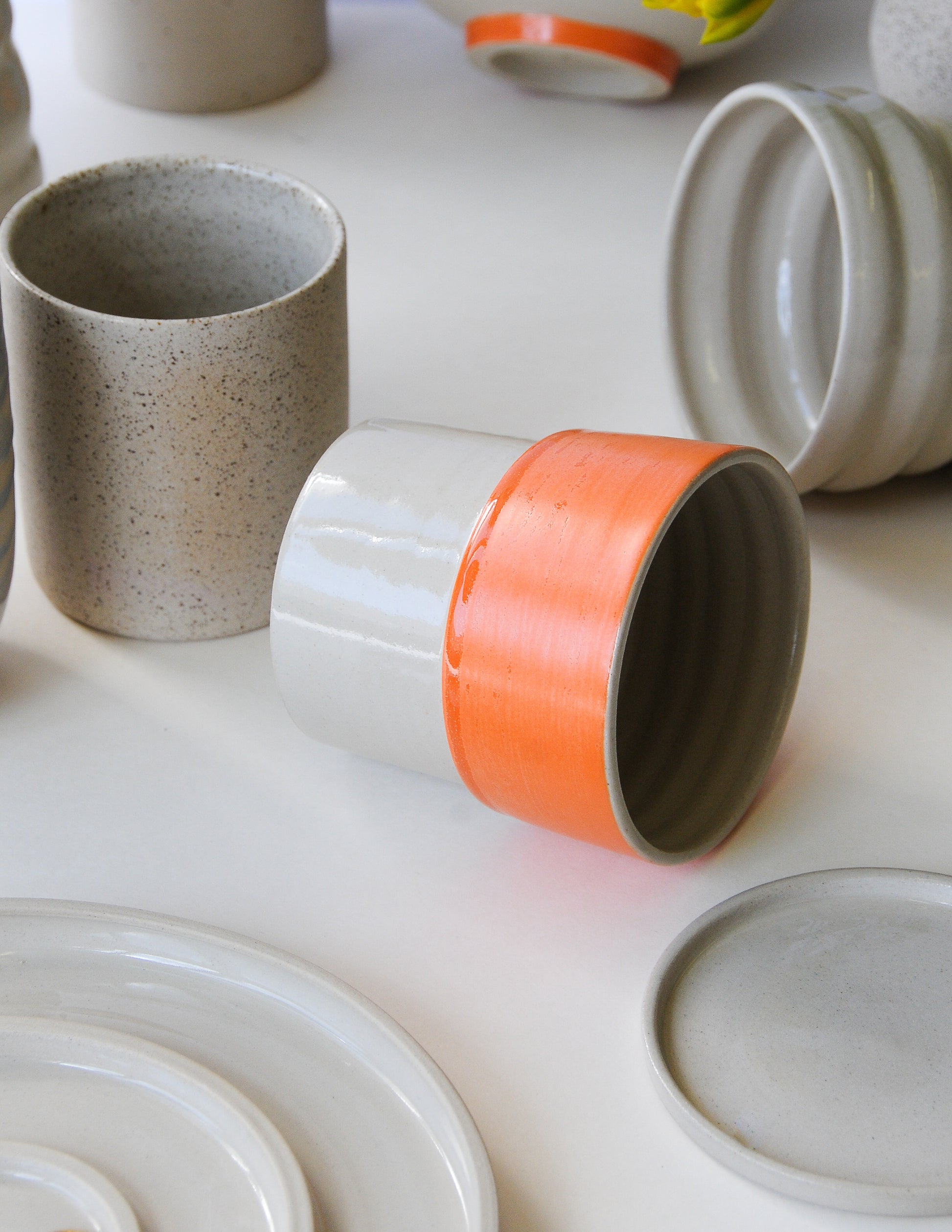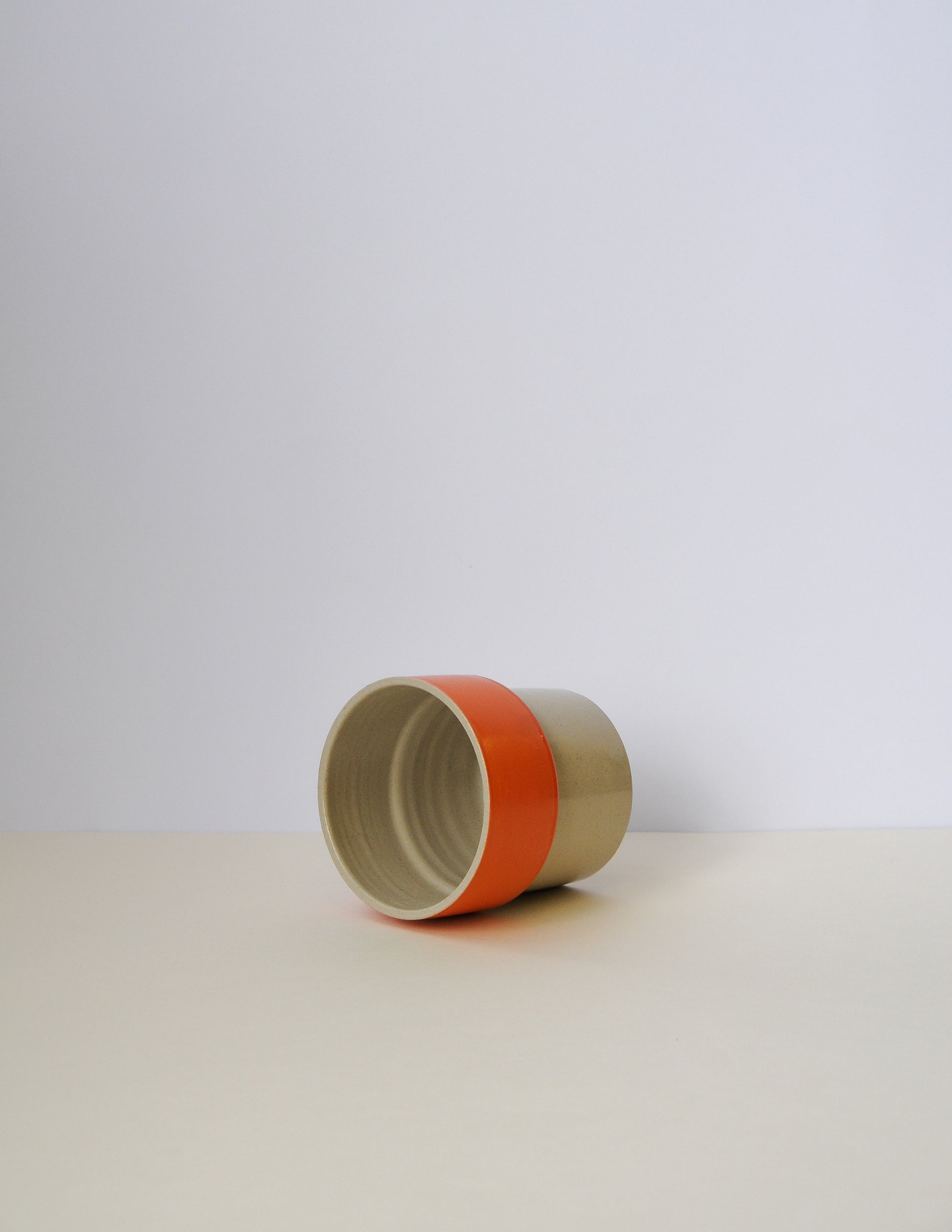 Becher gedreht aus hellem Steinzeugton mit handbemaltem Absatz in strahlendem orange, überzogen von glänzender transparenter Glasur.