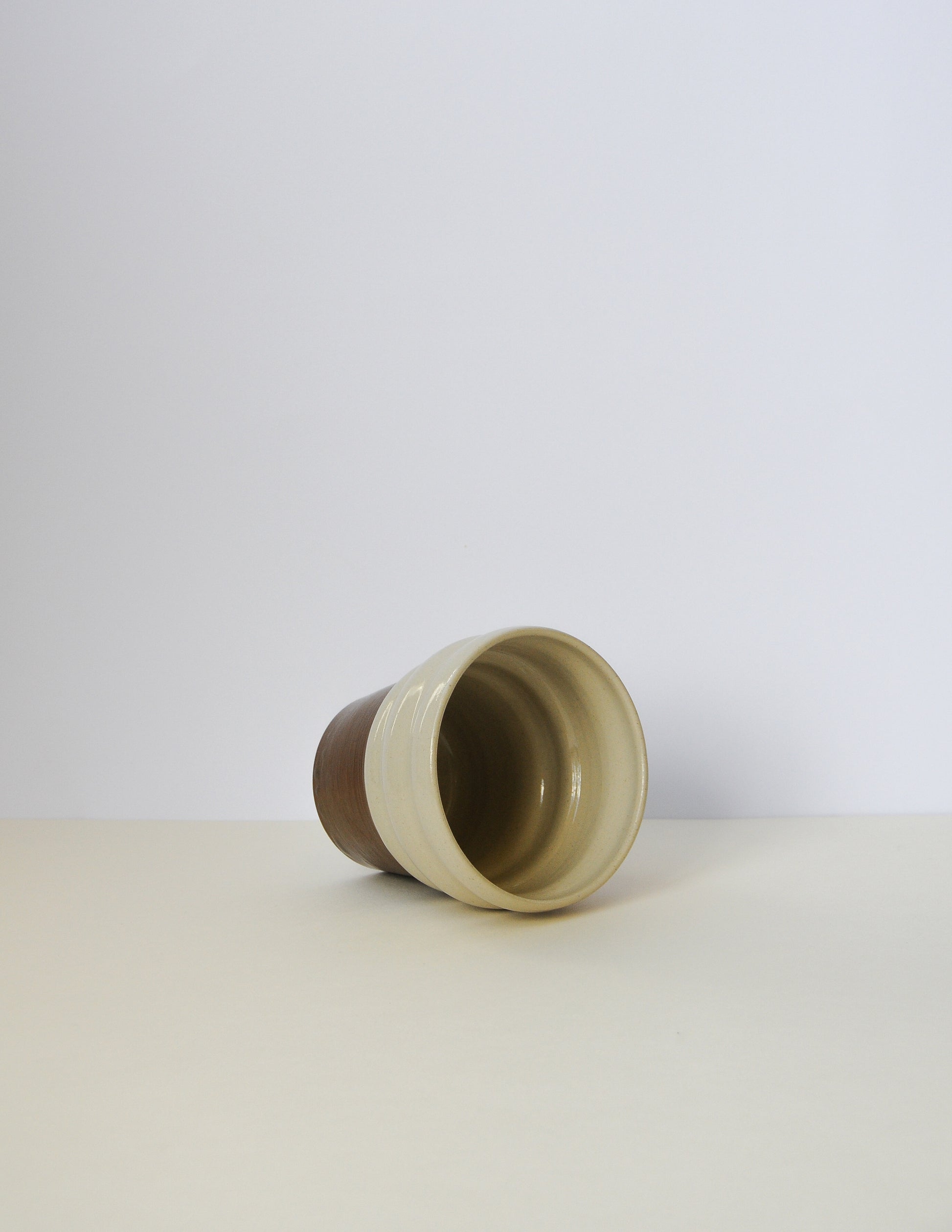 Außergewöhnliche Becherform, gedreht aus hellem Steinzeugton mit transparenter Glasur. Der untere Teil des Bechers wurde an der Außenseite mit brauner Glasur bestrichen.