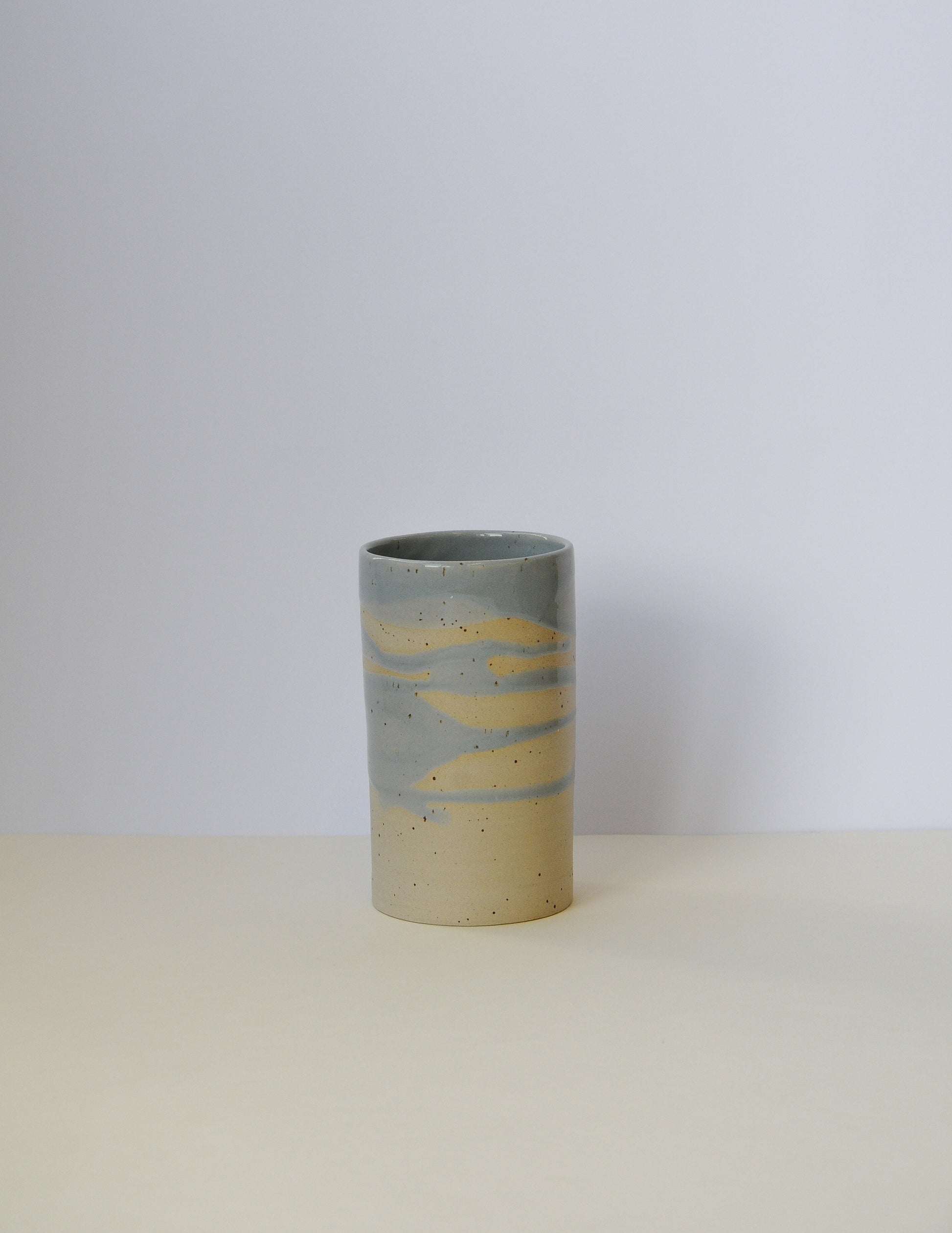 Vase/ Utensilienhalter gedreht aus hellem Steinzeugton mit vereinzelten Spots (Sommersprossen). Innen und partiell außen übergossen mit grau-blauer, glänzender Glasur.